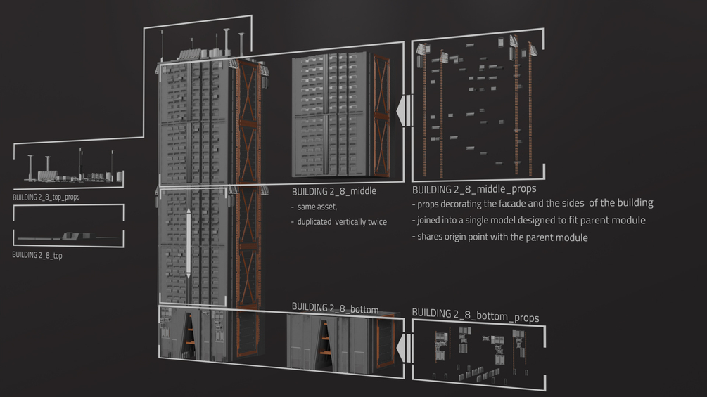 This asset kit contains 31 modular residential buildings designed to fit into a range of sci-fi design styles. Cyberpunk, classic sci-fi, dystopia, or just a simple near-future cityscape - as long as your setting has a room for boxy shapes and utilitarian design language, this kit is made to fit right in.